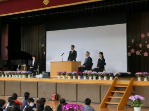 満開の桜が咲く中、令和7年度が始まりました。新しく異動してきた先生を迎えたあと、始業式を行いました。その後各学級で学級開きが行われました。午後からは新1年生を迎え入学式が行われました。
