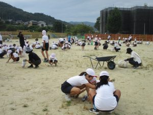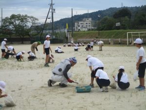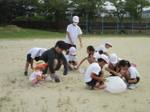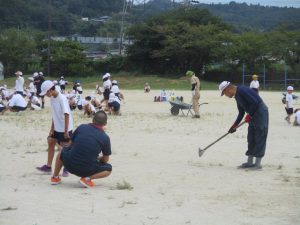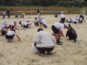 夏の間にたくさん生えた運動場の草を子供たと地域のボランティアさんと一緒に取りました。子供たちは異学年の縦割りグループ「なかよし」のグループごとに固まって作業をしました。明日5日と来週の11日(木)12日(金)と全部で4日間草取りを行う予定です。