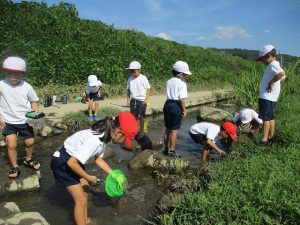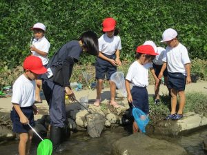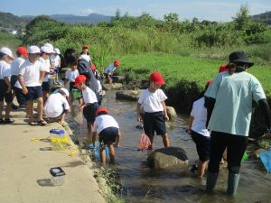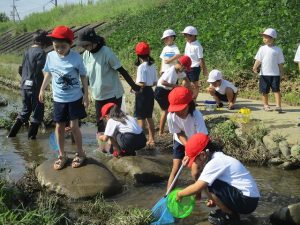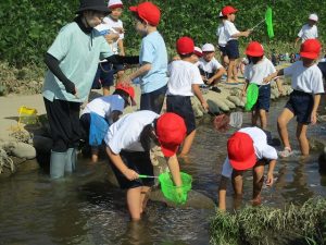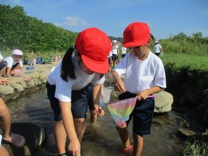 1年生は、先日の「虫となかよし」に続いて、今日は桔梗こども園前の土岐川の伏流に出かけ、水中生物を捕まえました。虫かごに捕まえた小エビやザリガニなどの水中生物を入れ、「たくさん捕まえたよ!」と笑顔で見せてくれました。