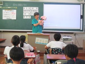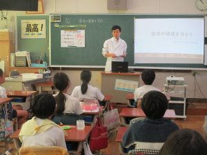 6年生が歯科医さん、歯科衛生士さんによる歯科指導を行いました。まずは、歯科医さんから芸能人やスポーツ選手など健康に気をつけている人は歯磨きを大切にしているという話を聞きました。歯科衛生士さんからは、歯磨きの仕方を教えていただきました。10月中旬から学校でも給食後に歯磨きを始める予定です。きれいな葉を保てると良いですね。