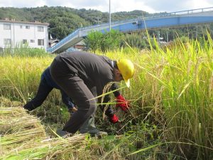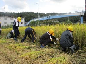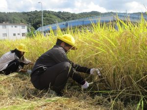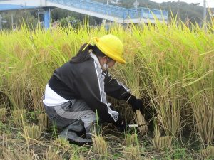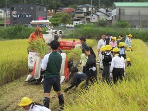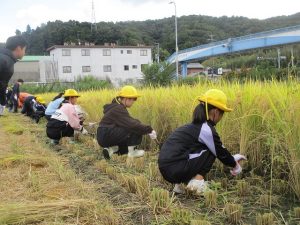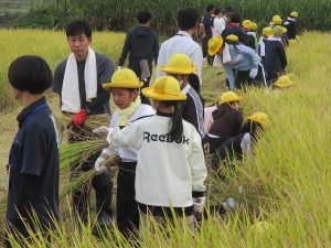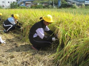 春に田植えをした米が順調に生育し、本日県事務所やJA等皆さんにご協力いただいて稲刈りを行いました。初めて稲刈りをする子供が殆どで、教えてもらったように腰をかがめ鎌でしっかりと刈っていきました。