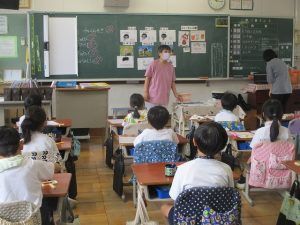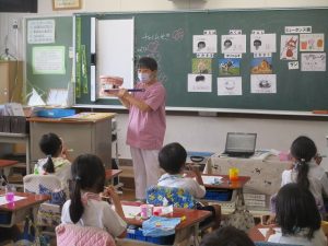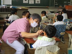 2年生は歯科衛生士さんから、虫歯にならずに丈夫な歯を維持するためのお話を聞きました。その後、染め出しをして歯磨きの仕方を学びました。学校では後期から給食後の歯磨きを始めました。自分の歯を自分できれいにできる子どもたちに育ってほしいと思います。