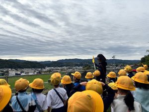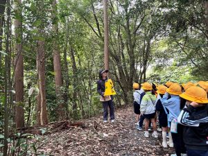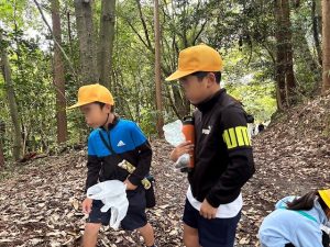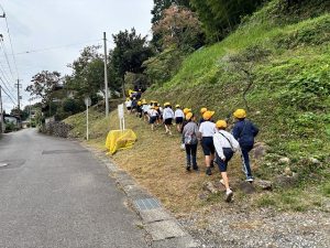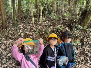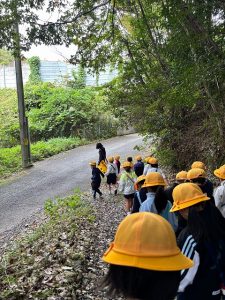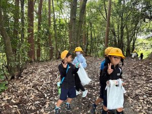 1年生は、10月21日に学校近くにある通称「どんぐり山」と呼ばれる山にどんぐり拾いに出かけました。集めたどんぐりを使って、いろいろな作品を作ったり、遊びを考えたりしていきます。
