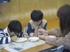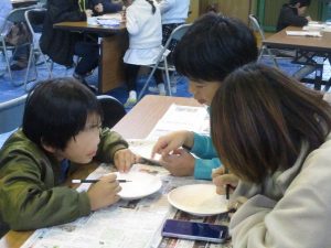 PTA家庭キィウイ区学級主催の「親子ふれあい活動」が行われました。活動内容は、昨年度に引き続き「絵付け体験」です。親子で楽しく、仲良くお皿に絵を描きました。素敵な作品がたくさん出来上がりました。完成が楽しみです。