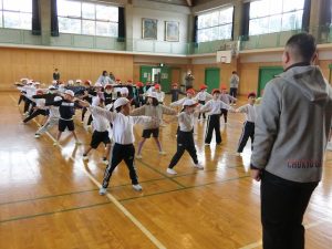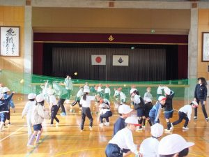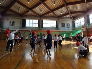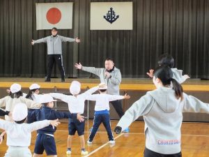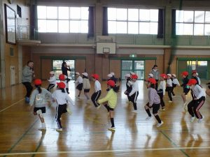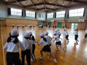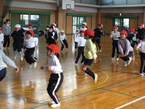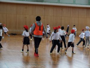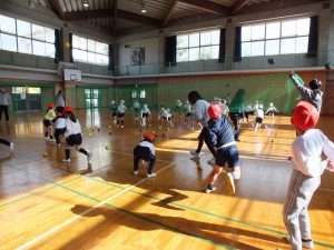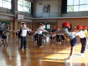 アクティブ・チャイルド・プログラム(ACP)という、楽しみながら体を動かす運動を、中京学院大学の先生と学生さんに来ていただき教えていただきました。子どもたちは大学の先生の指示をよく聞き素早く動くことができました。汗を流しながら笑顔いっぱいの1時間でした。