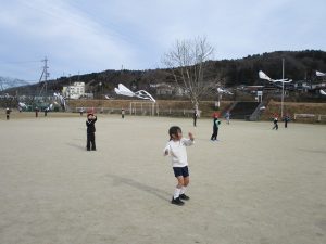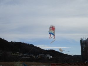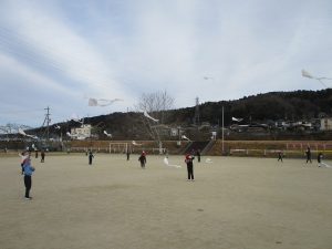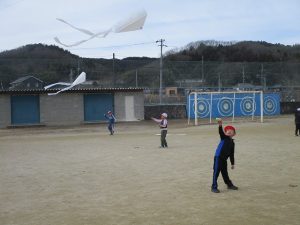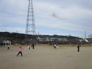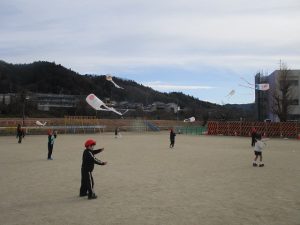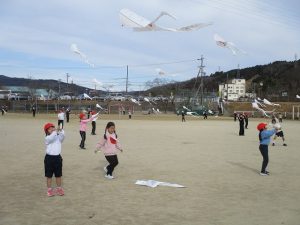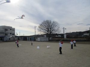 1年生は、生活科で凧あげを行いました。強い北風が吹く絶好の凧あげ日和の中、子どもたちは凧あげを楽しみました。子どもたちは強い風に自分が飛ばされないように一生懸命に立って凧糸を握っていました。風に乗ってどんどんあがっていく凧に子どもたちは大喜びでした。